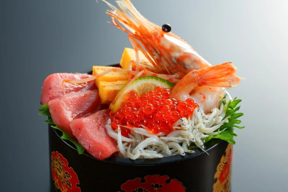 벳푸만에서 튀겨진 섬세한 가마 튀김하면, 마구로에 뿌리 푸리의 새우와 반짝이는 호화로운 맛을 화려하게 담아냈습니다.
