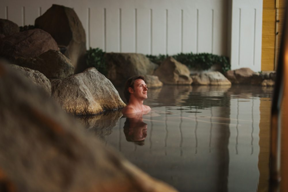 부드러운 빛에 희미하게 비추어진 차분한 온천 라운지의 공간에서는, 목욕 후에는 음료를 자유롭게 즐길 수 있습니다.
