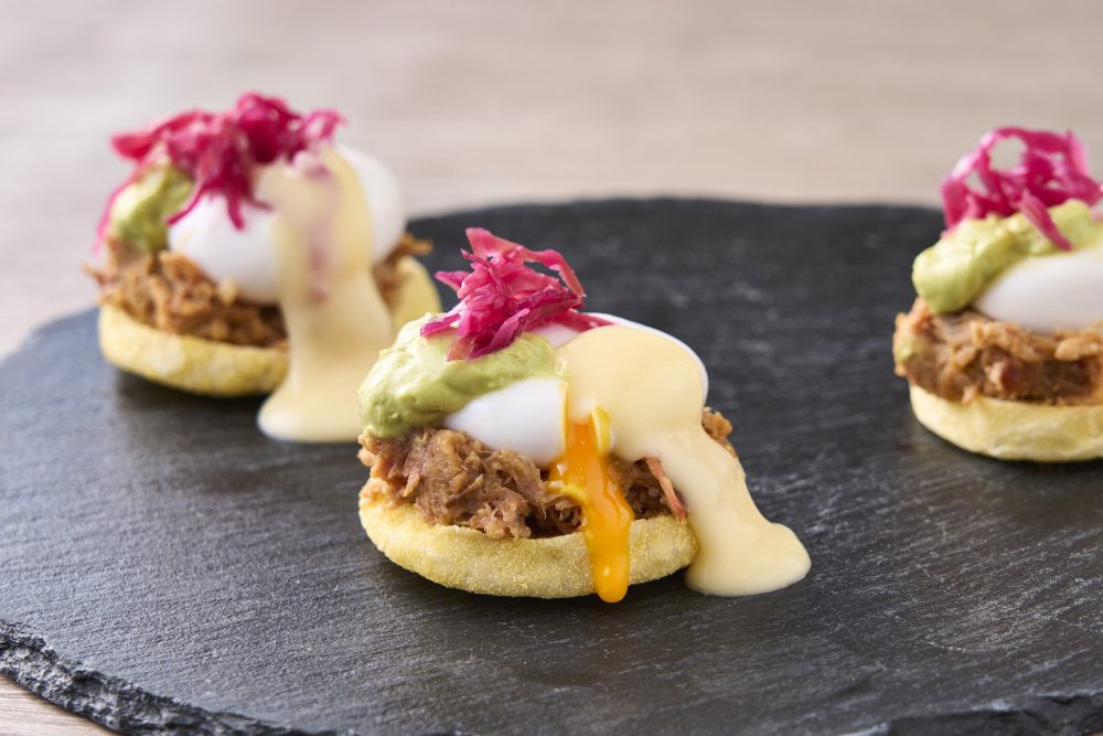 ほろほろにほぐしたプルドポークを、ベネディクトスタイルで仕上げた一皿。