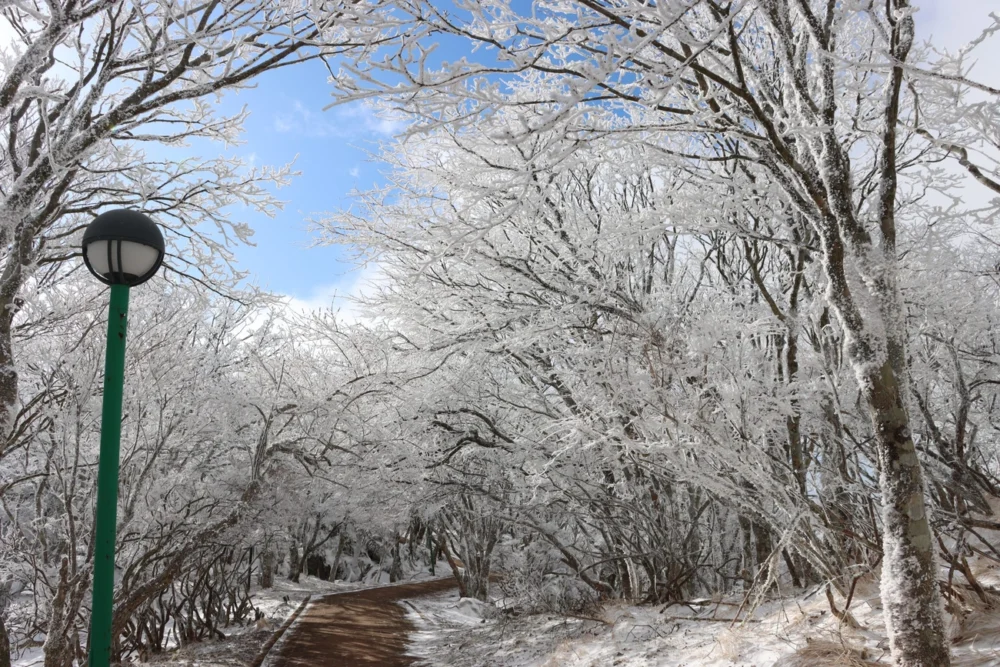 標高1,300mの山上一帯では、気温・湿度・風などの条件が揃えば、九州では珍しい霧氷の銀世界をご覧いただけます。