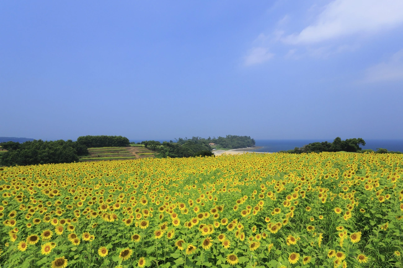 岬に広がる段々畑ですべてのひまわりが東を向いて咲く風景は圧巻です。